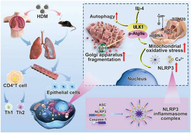 在此研究基础上,研究团队首次发现在IL-4诱导的细胞炎症中,Rab9蛋白在诱导高尔基体断裂方面发挥了至关重要的作用。抑制ULK1/Atg9a/Rab9的激活信号通路可以抑制哮喘中高尔基体的断裂和线粒体氧化应激,并减少NLRP3介导的肺上皮细胞炎症浸润的产生。