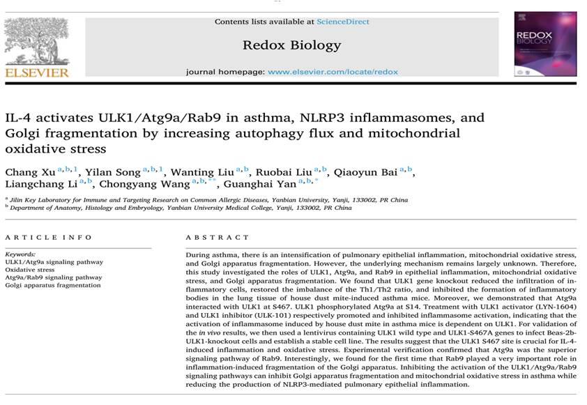 近日,我院延光海教授团队在国际著名杂志《Redox Biology》(IF:11.4,双一区TOP期刊)上发表了题为“IL-4 activates ULK1/Atg9a/Rab9 in asthma, NLRP3 inflammasomes, and Golgi fragmentation by increasing autophagy flux and mitochondrial oxidative stress”的最新研究成果。该研究通过运用ULK1基因敲除小鼠的方法,揭示了在哮喘疾病中ULK1/Atg9a/Rab9信号通路对气道炎症、线粒体氧化应激和的高尔基体碎裂的影响。